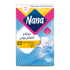فوط نانا اليومية المعطرة الطويلة مع تقنيةCour-V™ تتكيّف مع جسمك كيفما تحرّكتي. فوط يومية مع قوة امتصاص عالية وقدرة على امتصاص الروائح، تؤمن لك الحماية والإنتعاش طوال أليوم مع طول إضافي بمقدار 2.5 سم.. كما تتمتع هذه الفوط بعطر خفيف لتمنحك شعور بالانتعاش. راحة، امتصاص مثالي وثقة طوال اليوم.